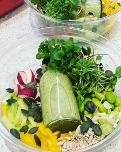 Our breakfasts include a variety of delicious and healthy options such as chia, blueberries, seeds, raw biotics, green machine smoothies, cocoa, oats, and nut butter. Our lunches consist of Buddha bowls, green goddess dressings, curries, microgreens, soups, our premium products, salads, and quinoa. Our dinners include babaganoush, falafels, hummus, olive,roasted cauliflower, chickpeas, sauerkraut, microgreens, our premium products, tofu, kimchi, sesame, butternut, soups, golden bowls, and lentils.